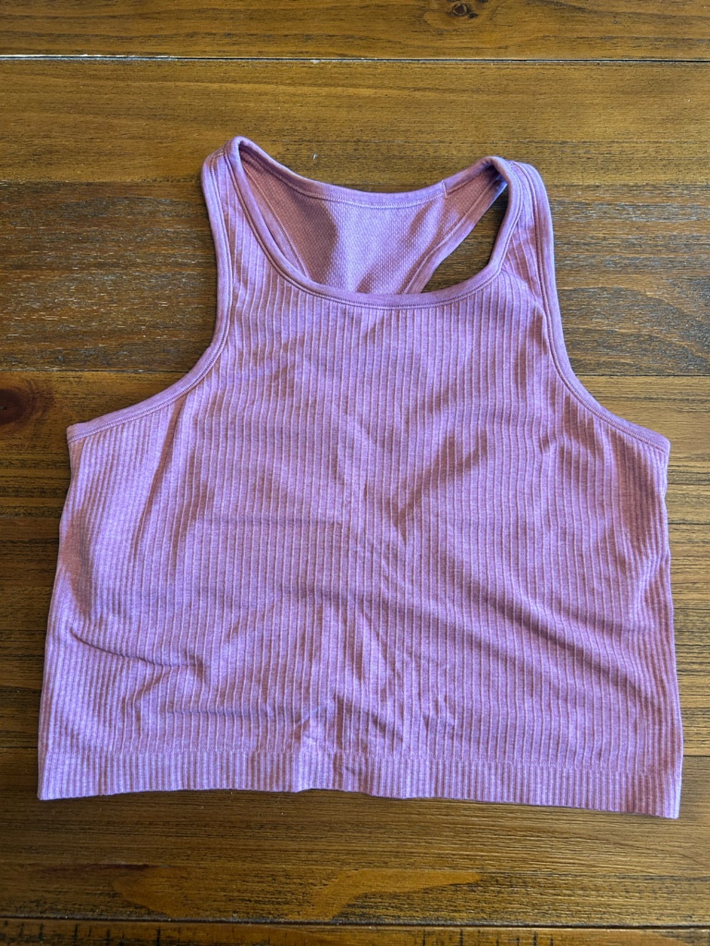 Soft ribbed support racerback crop tank. Dusty lilac/pale purple knit fabric.