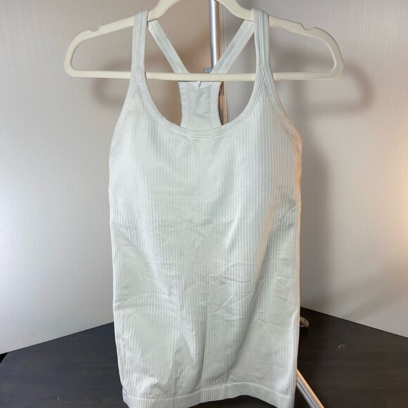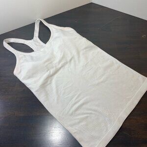 Minimal, flattering Lululemon ribbed racerback tank in a soft white / light ivory shade. Great for workouts, yoga, or everyday athleisure layering.