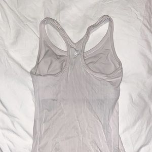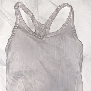 A size 4 grey-white Lululemon Racerback tank top with a sports bra liner. It’s solid white with a ribbed white pattern.