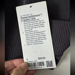 NWT Lululemon Ribbed Softstreme Cropped Tank Top in Black. Size 0! Brand new + perfect condition! 🖤