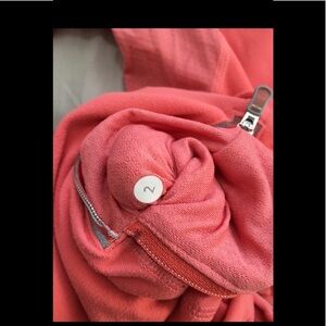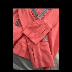 Preowned condition,just slightly sighs of wear and fuzziness, back left side pocket for phone or wallet, cute ruffles/reflective details on arms, thumbholes, stretchy, breathable, soft, no trades