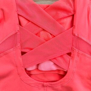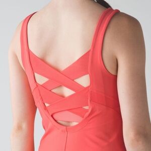 Lululemon Rise and Flow Tank in Cape Red. It's a Pinkish Orange--Maybe a Salmon or Coral. It has a built in shelf bra with removable cup pads. I removed them but can include a pair upon request. Size 8.