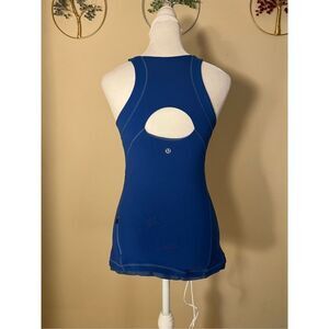 Royal blue Fitness tank top from Lululemon. Racerback style with decorative cut out. Built in shelf bra with openings for optional breast padding (not included). Gently used.