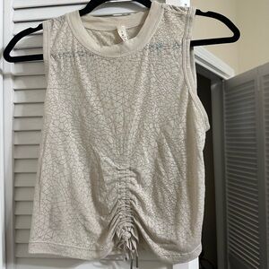 Stylish cream sleeveless crop top with ruched front detail. Perfect for casual wear.