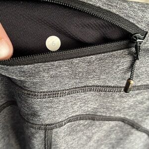Excellent condition. Stylish gray and black leggings featuring convenient side pockets and zippered back pocket. Inseam 24”