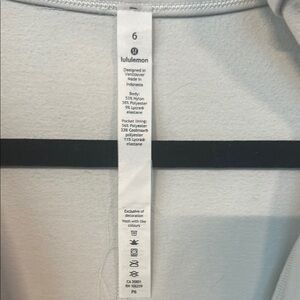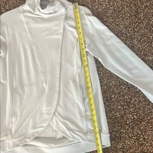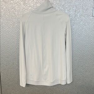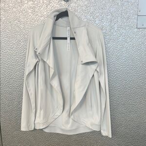 This is a beautiful Lululemon Rulu Rally Wrap. It has a High Neck with Snap Button closures. Has pockets at hips, thumb holes. Womens size 6. Very soft material, stretchy, comfy and CUTE! I'm not sure of the actual color name but a very pale green, almost cream. Could easily pass as a neutral.