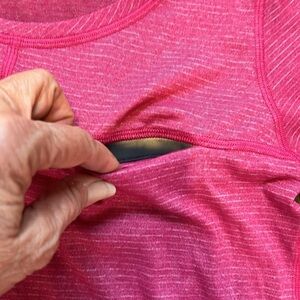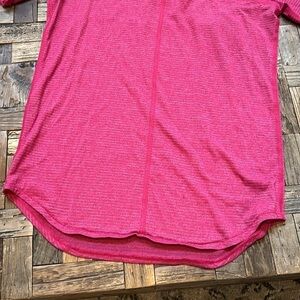 Lululemon Run Away T-Shirt in Heathered Bumble Berry. Relaxed fit, hip length. Soft, lightweight Luon fabric. Front chest pocket. No size tag, see approx measurements below for accurate fit: