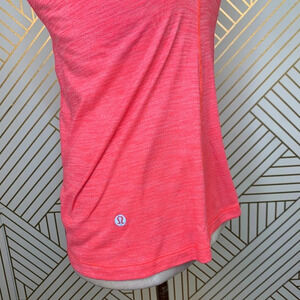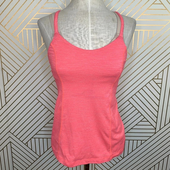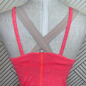 Lululemon Run For Gold Tank in Heathered Electric Coral / Naked. Bra tank combo designed for yoga, running, and everything! Silverescent technology. Luxtreme® fabric bra is sweat-wicking and four-way stretch. The internal bra supports B and C cups best.