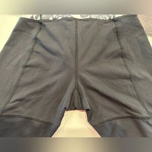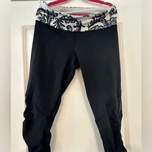 Lululemon cropped leggings, Run For Your Life in Laceoflage, women's 10, 77% nylon/23% Lycra spandex. Back zipper pocket, interior drawcord, mesh detailing, gathered with ruffles and reflective details around knees, black with cream and black, mid rise. Light wea