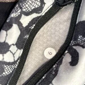 Lululemon cropped leggings, Run For Your Life in Laceoflage, women's 10, 77% nylon/23% Lycra spandex. Back zipper pocket, interior drawcord, mesh detailing, gathered with ruffles and reflective details around knees, black with cream and black, mid rise. Light wea