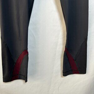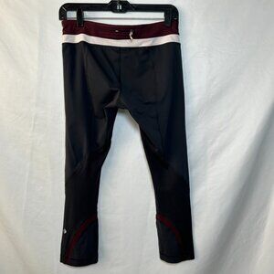 These Lululemon crop leggings are designed for high-performance activities with comfort and style in mind. The black body with a burgundy and beige waistband provides a unique, eye-catching color combination. Features include a secure waistband pocket with zipper, perfect for keeping essentials during workouts. The breathable mesh panels on the lower legs offer enhanced ventilation, making them ideal for intense exercise. Excellent pre-owned condition with the classic Lululemon logo on the leg.