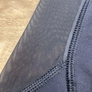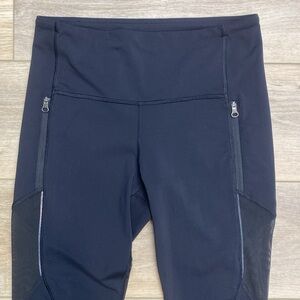 Solid all black mid rise two front zipper pocket mesh panel cropped running leggings by Lululemon Athletica. One interior waistband pocket with hidden drawstring. Cropped length with angled sheer mesh across the thigh with reflective accents. In excellent condition, gently used. Size 6