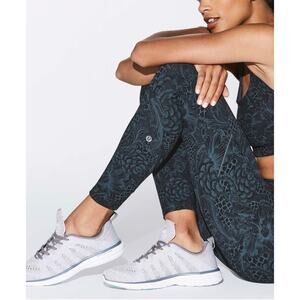 Lululemon Run On Tight, Lululemon pocket leggings, high rise running tights, Nouveau Mach Blue Black, Lululemon EUC, 25 inch leggings, floral print leggings, workout pants, training tights, athleisure