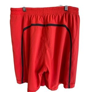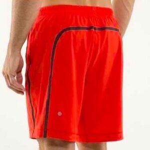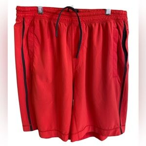 Mens LULULEMON Comfortable and stylish red men's athletic shorts, single black side & back stripes. The shorts have a three pocket design, 36 inch elastic waist with drawstring, the length is 19” perfect for workouts or casual wear. See photo one small stain in left pocket area