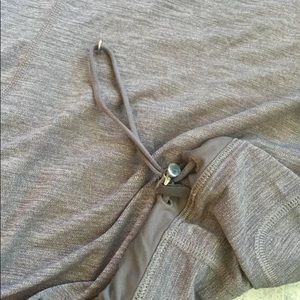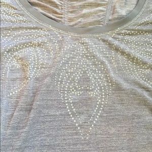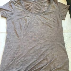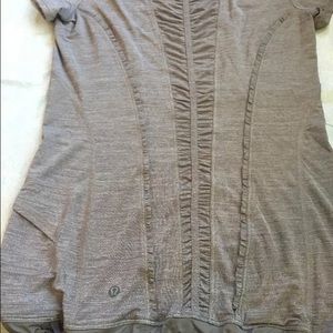 This is a super nice and cute Lululemon short sleeve shirt sz 4. The exact color is hard to describe, but the best way to describe it is light purple with a tint of grayish gold, It is incredibly flattering and fashionable for both everyday and yoga/other sports. The waist is adjustable with shiny metal pieces and a silver lulu charm. There is a pocket on the left side. The back is elaborate with flat Grey stitching and slight ruffles. Around the collar is a raised peacock design.