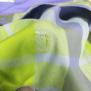 Color: Light purple waistband, leg binding and stitching. Multi-colored purple, white, neon yellow plaid pattern.