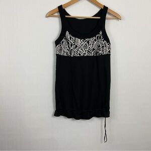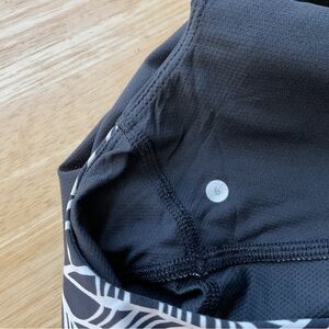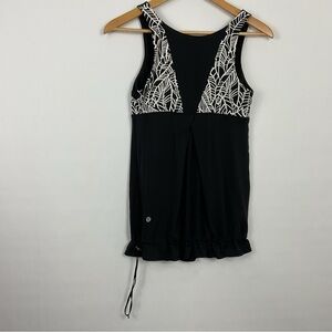 Lululemon Run Ta Ta Topper Tank Top. Womens Size 6. Black palms. Cinched waist. Sleeveless. Pleated look in the back. There is a mark on the top. No fabric tag. Please see all photos for any flaws or conditions. A33