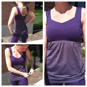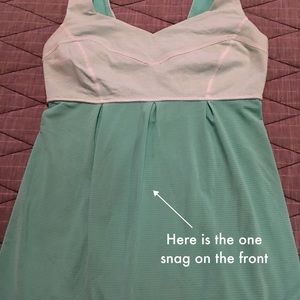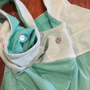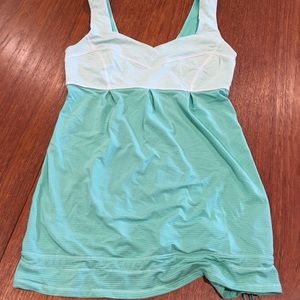 Great condition- 2 tiny snags you can't really see when worn, no built-in bra, discontinued Run Tame Me tank by Lululemon in size 4. A beautiful minty aqua green color with a slightly blousey tummy section and a nice cinch cord at the bottom hem. Absolutely love this tank but it doesn't fit me anymore! Regular bras don't show under and if you sport a criss crossed back bra, looks super cute in back. Images of model found on google as en example of how it fits-- not the actual tank for sale.