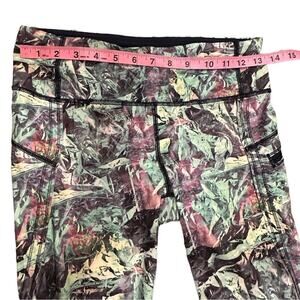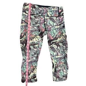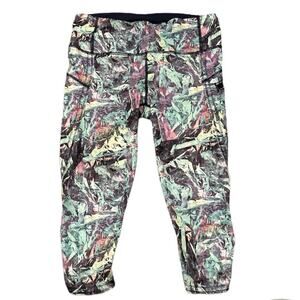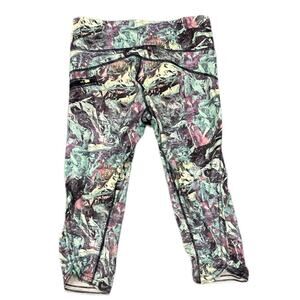 Excellent condition Lululemon top speed crop leggings in iridescent multi print. Size tags removed but measurements included - size 6. Side zip pocket to keep keys and other small items.