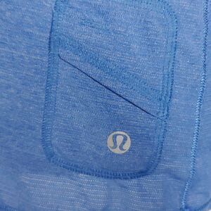 Heathered porcelain swiftly tech material blue short sleeve top with reflective silver chest design with gathered elasticized neckline and side pocket. Excellent condition. Top measures approximately 17" across bust and 24" from shoulder to bottom.
