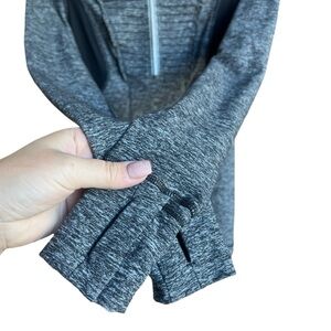 Women’s size 4 Heathered black/grey Run Your Heart Out half zip pullover by Lululemon. This jacket has thumb holes and zippered diagonal pocket at the back to keep your possessions secure while on the go.