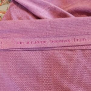 Soft knit. Pretty color. Holes for your thumbs. Inspirational words. Showing on my 4-5 mannequin, but there is stretch. A couple snags, pictured, not a distraction, just hard work.