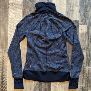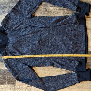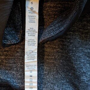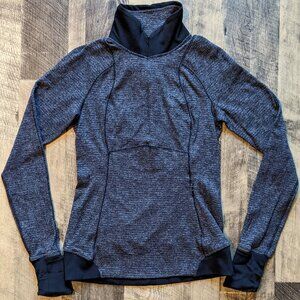 This is a Lululemon Runderful sweatshirt tee in a grey Heathered Black color. It is in excellent pre-owned condition. It is a size 6, and the last three images show measurements. Designed for running, slim fit, side zip pocket, ½ zip at the chest, high shaped collar mockneck, soft sweat-wicking stretchy Rulu fabric, reflective details for visibility in low light. Long sleeves with thumbholes and cuffins, where the cuffs have an extra flap that folds over your fingers, like built in mittens.