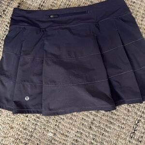 Lululemon athletic running/tennis skirt in black with built-in shorts. The interior branded elastic shows authenticity, but the size tag has been removed. Skirt fits like a Medium (M) based on measurements and overall fit. Lightweight, sweat-wicking fabric — perfect for running, training, tennis, or everyday athleisure.