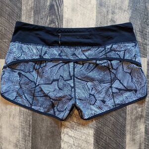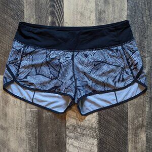 These are Lululemon Speed Shorts in Dottie Tribe White Black. They are in excellent condition. They are a size 8, and the last two images show measurements. Designed for running. Sweat-wicking quick drying Swift Ultra fabric with four-way stretch. Pull-on style with continuous drawcord, lightweight liner, front gel pockets, zippered back pocket.