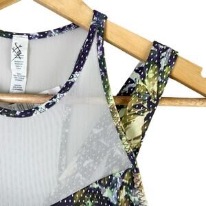 Features: high round neckline, mesh panel upper front, upper back, and mid-back, racer back, fitted, flattering exposed princess seams, built-in bra (cup inserts not included). Color: pistachio leaf multi / green and purple with white dots.
