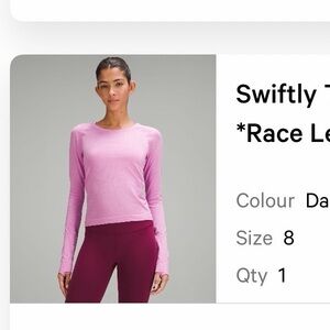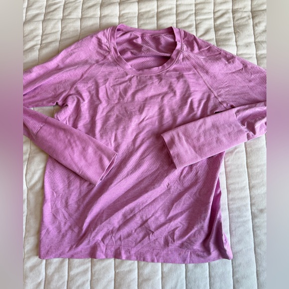 Excellent condition. Worn once. Size 8. Lululemon swiftly long sleeve RACE length. Limited edition sold out color DAHLIA MAUVE.