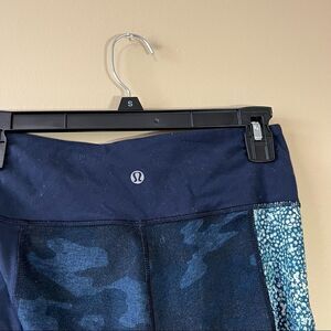 Lululemon women’s navy blue Sashiko Camo patchwork Wunder Under leggings.