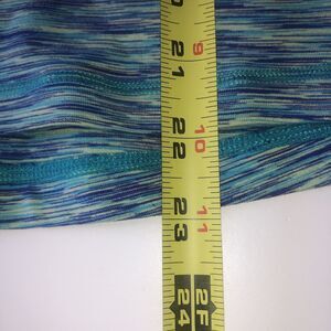 This is a sleeveless tank top in green with a striped space dye pattern by lululemon athletica. It features a scoop neck, a built-in bra, and a pullover closure. The tank is size 8 and has an athletic fit, suitable for activewear activities like gym training, yoga, and running. It is machine washable and versatile for winter, summer, fall, and spring seasons.