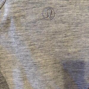 Lululemon Scuba Hoodie in heathered gray, size 6. A cozy and structured hoodie featuring a high funnel neck for warmth, full zip closure, thumbholes, ribbed stretch side panels for comfort, and hidden media pockets. Iconic Lulu logo at back and zipper pull.
