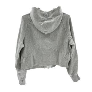 Lululemon 'Scuba' Grey Cashmere Oversized Full-Zip Hoodie Size M/L: naturally breathable, cotton-blend fleece fabric, lightweight warmth, oversized fit, waist length, front pockets with interior card sleeve, zipper garage, elastic zipper pull doubles as an emergency hair tie, thumbholes, measurements: 22 inch bust x 20.5 inch length.