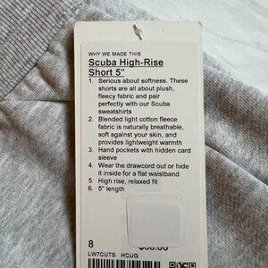 Lululemon Scuba High-Rise Shorts 5" in Gray new with tags in Size 8! Cute and comfortable. Not flattering on me, sadly.
