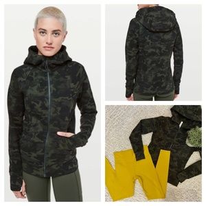 Gorgeous Lululemon Scuba IV hoodie sweatshirt! Warm and soft; cozy light cotton fleece, thumbholes, full zip front, zipper garage, stretch panels at sides, media pocket. Awesome Gator Green Camo print no longer available online.