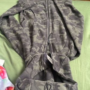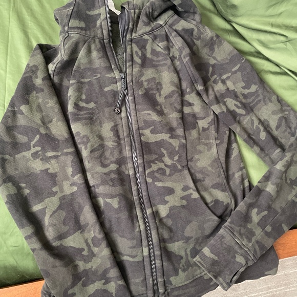 Very good condition lululemon green camo scuba hoodie. Great for all your outdoor camo needs! Also non outdoor needs. This camo looks so great . Especially with all the bright colors and blues,/ blacks.