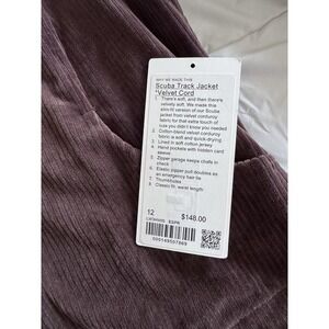 Lululemon Scuba Track Jacket is a mid-length jacket made of cotton blend velvet corduroy material in espresso color. It features a full zip closure, thumbholes, pockets, and is breathable, lightweight, and easy to care for. The jacket is lined with cotton and has insulation made of polyester, making it suitable for all seasons, including winter, fall, and spring. It is perfect for any occasion, whether you're traveling, engaging in sports, or just going casual. The jacket fits a regular size 12 and is part of the Lululemon Scuba product line.