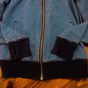 Lululemon Athletica Striped zip up Scuba jacket Size 4 with thumb holes. Two front side pockets. This is Pre-Owned & Dark blue hem on jacket is slightly faded but overall good condition. No holes. See pictures :)