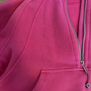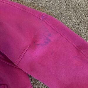 Fleece inside, still very comfortable, I haven’t worn it in a year. Slight stains from washer but will likely come out with stain treatment. Hot pink color!