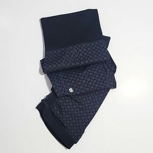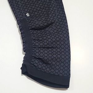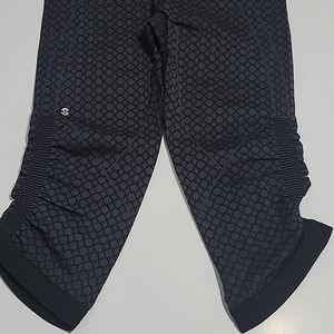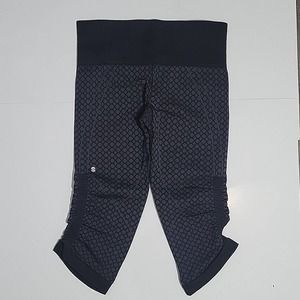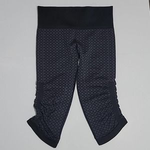 article worn several times so do show wear. tag gone shown on flip side of leg. seamless charcoal geometric detail. silver signature logo on back. cropped. cinched accents. tiny hole between legs. see pic.