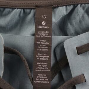 Keywords: Lululemon, Men's Shorts, Athletic Shorts, Training Shorts, Gym Shorts, Workout Shorts, Blue Shorts, Gray Shorts, Size 38, Drawstring Shorts, Activewear, Recycled Nylon Shorts, Comfortable Shorts, Lightweight Shorts