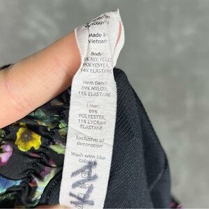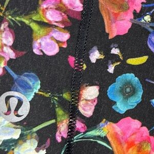 Description- black in color with colorful floral print. 4 way stretch. Sweat wicking. Secret pocket.