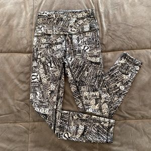 NWOT Lululemon Wunder Train Signature leggings, size 4 with 25” inseam. Tear It Up Alpine White Black. Perfect condition. White and black with the Lululemon logo and signature throughout the print.