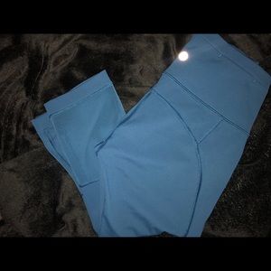 Blue lululemon cropped leggings! These were a gift last year so I honestly don’t know the exact kind but I’m pretty certain they are aligns based on the feel/fit! Only worn a handful of times before I outgrew them!