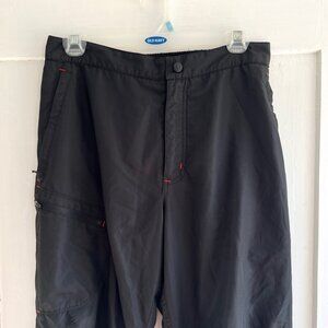 GUC black softshell pants from Lululemon! Worn before with some fraying along the hems, but otherwise in very good condition. Features zip hand pockets and one zip pocket on the leg, elastic along back waist to ensure a good fit, vented areas behind the knees for breathe-ablilty and mesh lining. Very high quality! Perfect for colder pursuits like hiking or camping, or as warm up pants before/after events - easy to fit over shorts or leggings. Wind and weather proof but still breathable and lightweight!