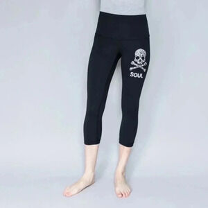 Black with silver skull crossbones and "Soul" on front. Image has some cracking. Low rise, zippered pocket at back of waist. Lots of stretch, stitching detail at cuff. Capri cropped leg leggings.
