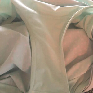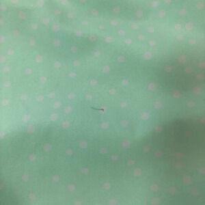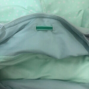 Mint green with white polka dots, one zip waistband pocket, 2 open pockets on front waistband, spot on front right looks like pen mark, spot near logo on back near hem see pictures, drawstring waistband, colors may vary due to lighting, good used condition, size: 6
