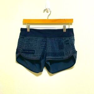 Lululemon Speed Shorts Size 6 2.5 inch inseam. Classic black shorts with gray branding pattern. Always hang dried. EUC. No flaws or major signs of wear.